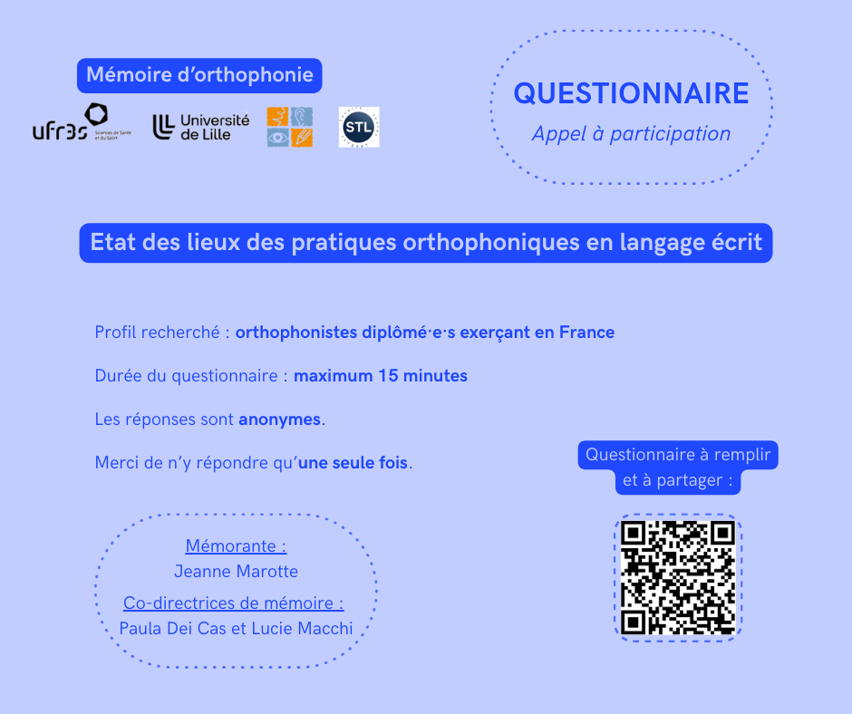 Merci d’avance pour votre temps et votre contribution !Jeanne Marotte, étudiante en 5e année d’orthophonie à Lille.